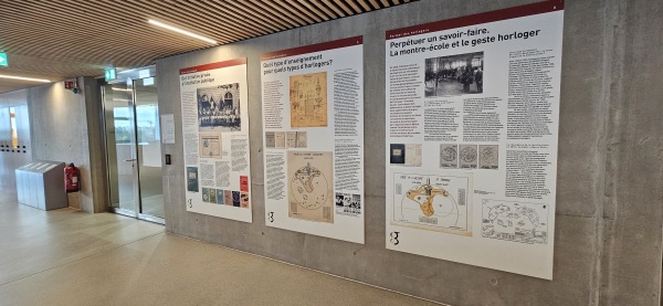 Présentation de deux panneaux exposant l'histoire de l'Ecole d'horlogerie de Genève.